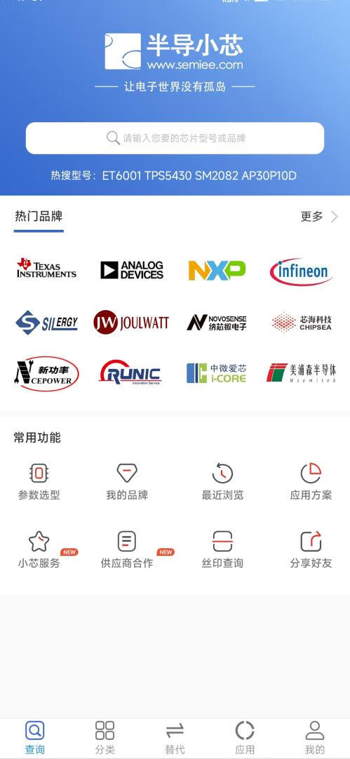 半导小芯是一款专门提供芯片资料查询的免费工具,当前涵盖了2500多家国内外芯片厂商的数千万份实时资料,包含数据手册、应用手册和技术文章等。半导小芯是为电子工程人员和采购人员而专门设计,侧重于便捷和实用,支持一键发送资料到邮箱、一键秒开PDF文件、快捷分享资料到微信/QQ等功能。