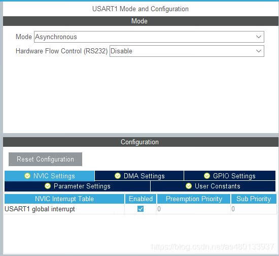 这里以串口1为例 我们可以选择串口的模式(异步,同步,半双工) 串口接收中断,和串口DMA传输等等