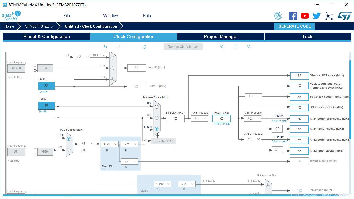 其实也就是32的时钟树框图让你配置 默认时钟是使用内部RC振荡器(HSI)